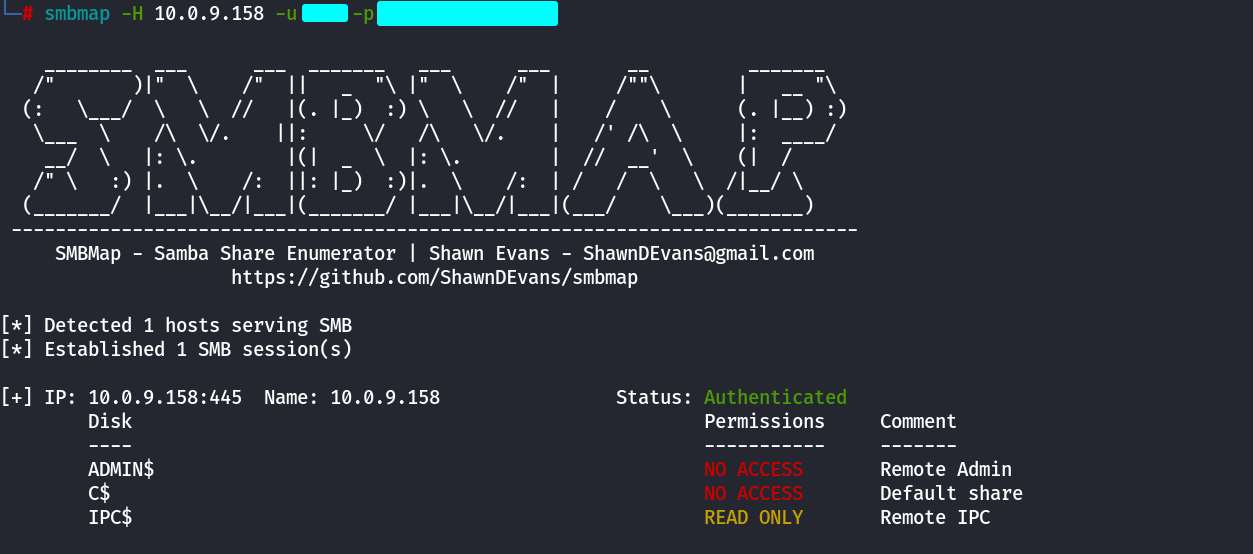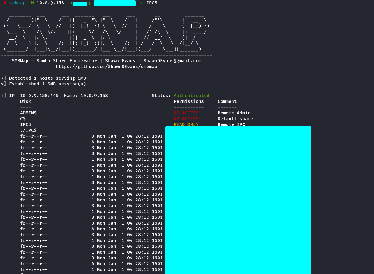 smbmap -H 10.0.9.158 -u username -p 'password' -r IPC$