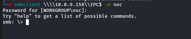 smbclient \\\\10.0.9.158\\IPC$ -U noc