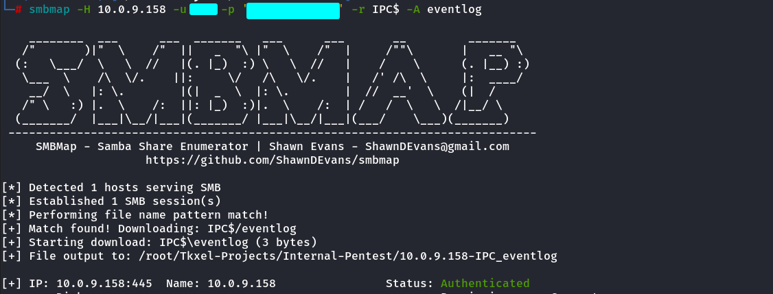 smbmap -H 10.0.9.158 -u username -p 'password' -r IPC$ -A eventlog