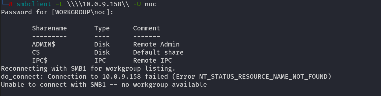 smbclient -L \\\\10.0.9.158\\ -U noc