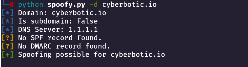 We can use **spoofy** to find out Weak Email Security, Weak email security (SPF, DMARC and DKIM) may allow us to spoof emails to appear as though they’re coming from their own domain.  [Spoofy](https://github.com/MattKeeley/Spoofy) is a Python tool that can verify the email security of a given domain.