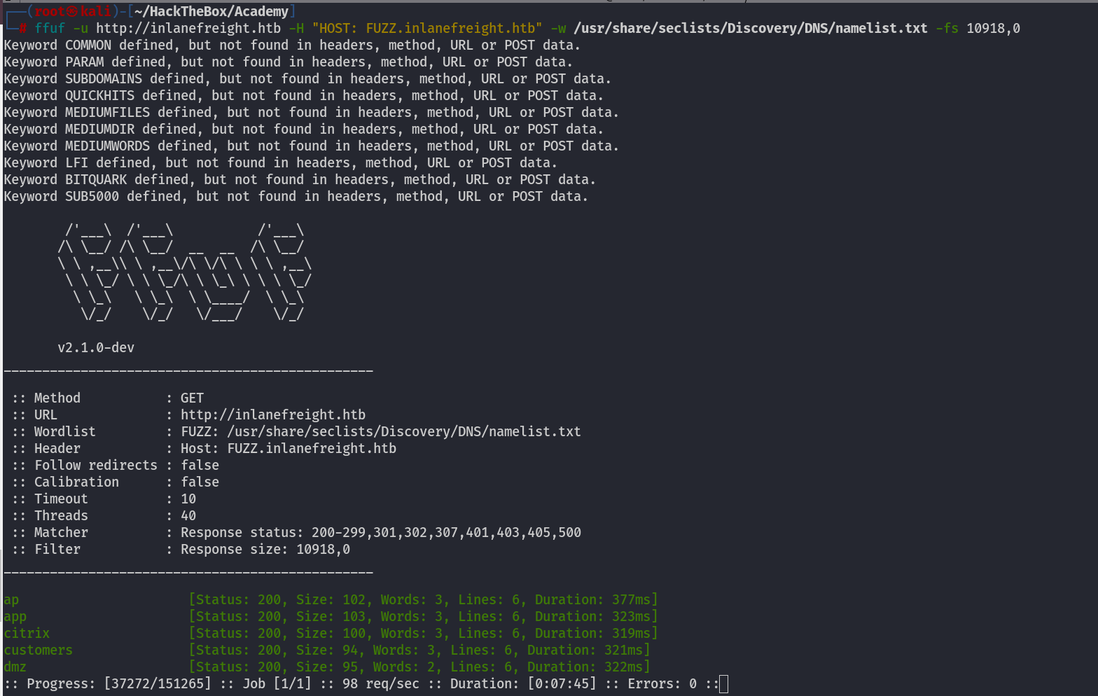 ffuf -u http://inlanefreight.htb -H "HOST: FUZZ.inlanefreight.htb" -w /usr/share/seclists/Discovery/DNS/namelist.txt